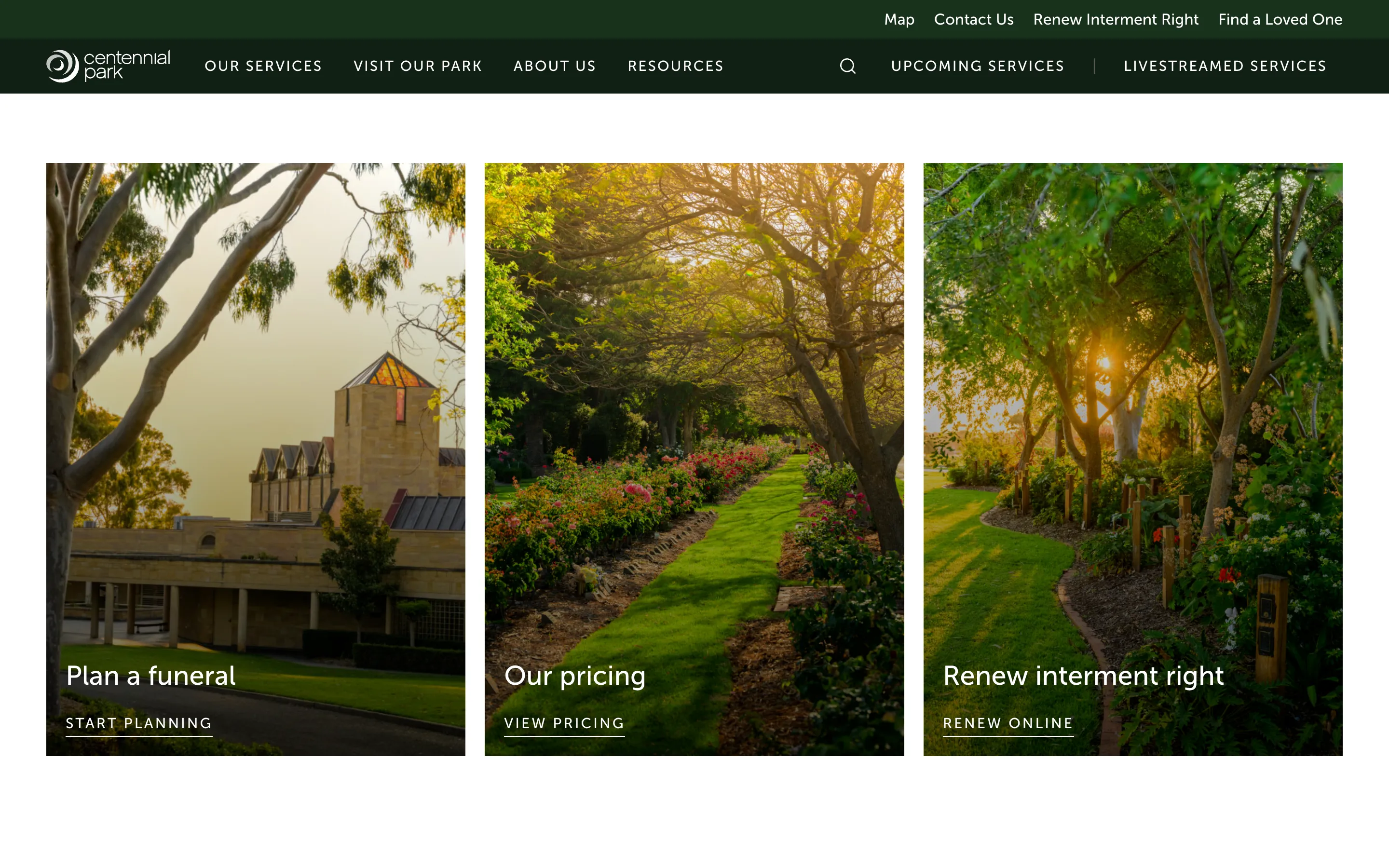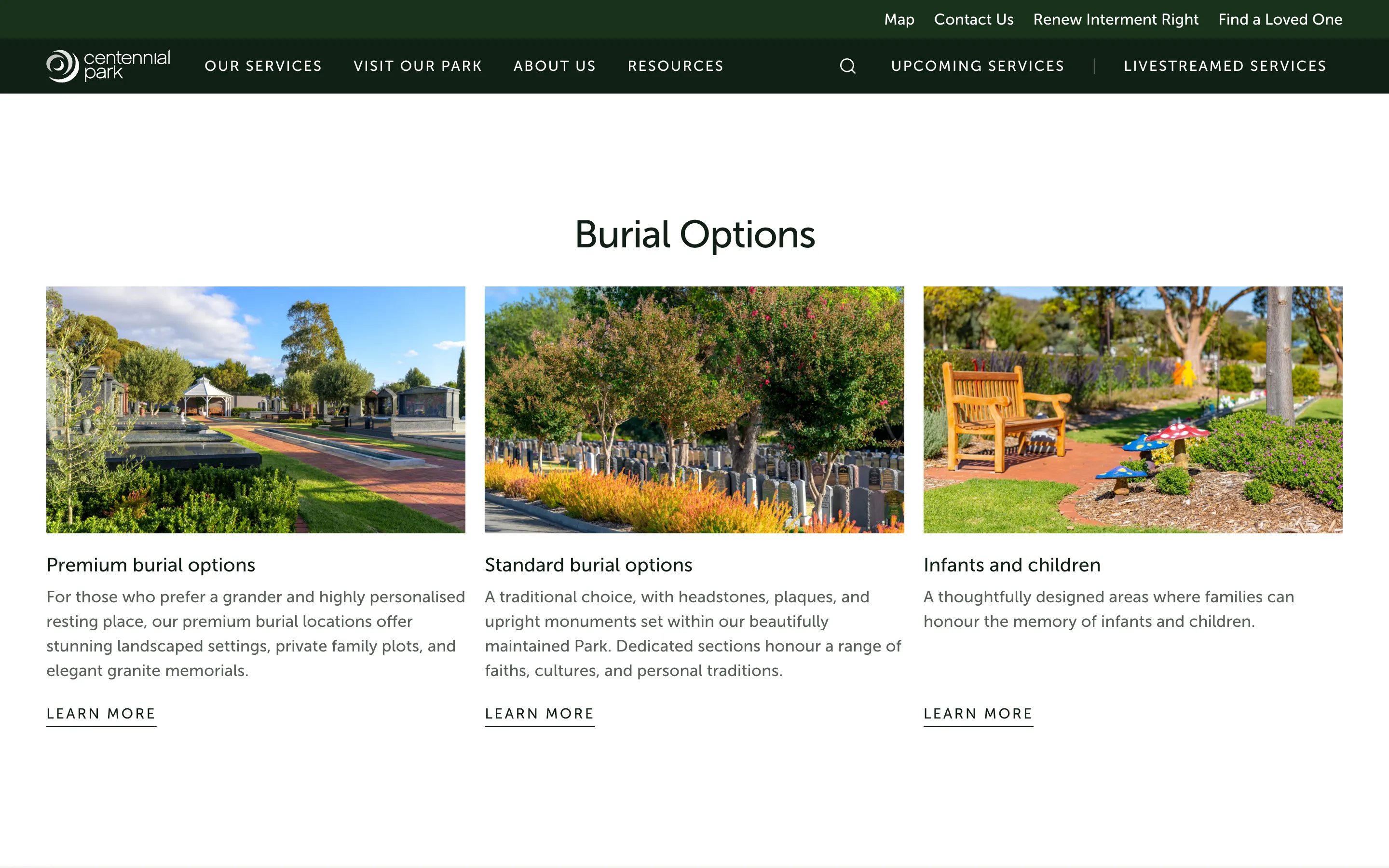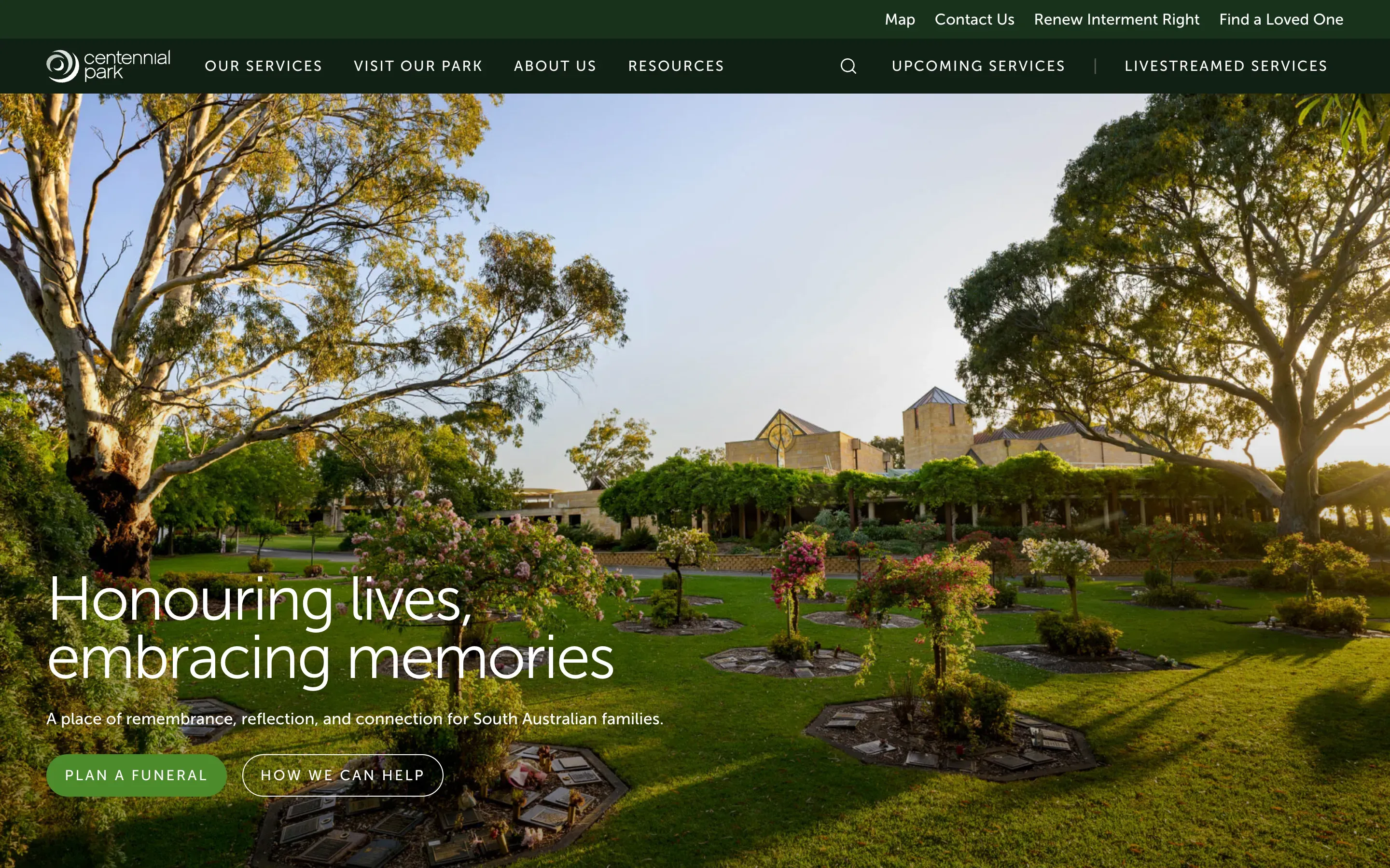 Website refresh for a cemetery and park in Adelaide, showcasing the existing brand and imagery, reorganising funeral and cemetery services, and improving the search and payment experience for interment rights.